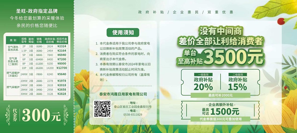 如今,泰安市舉行家電以舊換新補貼政策,我公司三類產(chǎn)品成功入圍,包括空氣源熱泵熱風(fēng)機、冷水機組和燃氣壁掛爐。消費者購買我公司一級能耗產(chǎn)品可享受政府 20%的補貼,二級能耗產(chǎn)品可享受 15%的補貼。在此基礎(chǔ)上,我們面向全市消費者再額外發(fā)放 300 萬的代金券,單張面值 300 元,共 1 萬張。這意味著在政府補貼的同時,消費者還能享受我公司讓利 300 至最高 1500 元的優(yōu)惠,真正實現(xiàn)政企雙補,福利翻倍。